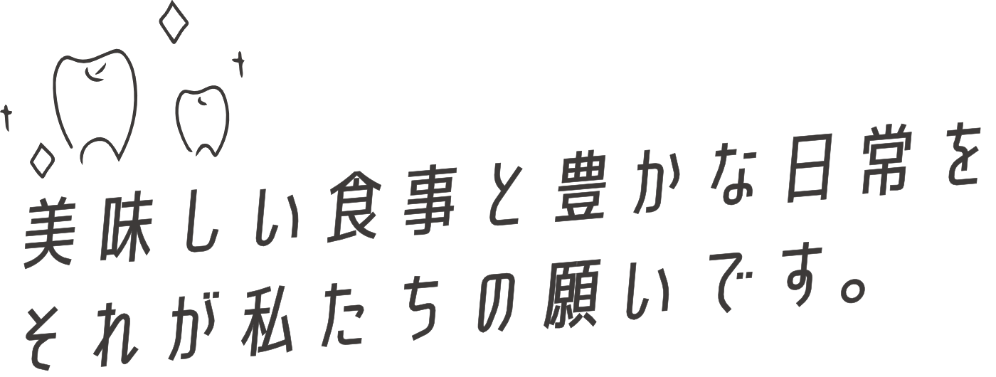 『いくつになっても、美味しくご飯を食べられる』ためには、しっかりかめるお口が大切です。当院では、予防を通じたお口の健康管理、かみ合わせの精査、入れ歯であればしっかりかめるためのメンテナンスに力を入れ、多くの方の日常に“健康”と“笑顔”と“幸せ”が溢れるようにと考えています。10年・20年先の毎日もあなたが笑っていられること、それが私たちの願いです。