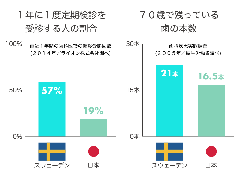 特に上のグラフを見てみると、歯科先進国でもあるスウェーデンと日本の歯の残存数の違いは歴然です。